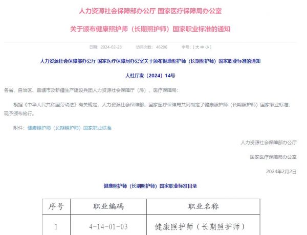 2020年,健康照护师这一新职业被正式纳入我国职业分类大典,标志着其职业地位的确立。时至2024年2月,国家人力资源社会保障部办公厅又进一步颁布了健康照护师(长期照护师)的国家职业标准,为这一职业的规范化发展奠定了坚实基础。