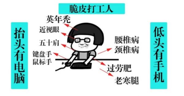 “脆皮”一词源自游戏用语,形容防御力低下、生命值脆弱的角色,如今却成为年轻打工人的真实写照。“刷视频笑岔气”“上厕所蹲麻腿”等夸张笑谈背后,折射出年轻人令人堪忧的身体状况。职场“亚健康”已然成为一种常态。久坐引发的腰椎间盘突出,长期加班导致的颈椎病,过度用眼造成的视力下降,再加上情绪焦虑、睡眠质量差等问题,让许多打工人调侃自己“20岁的年龄,60岁的身体,10岁的经济条件,3岁的情绪管理”。