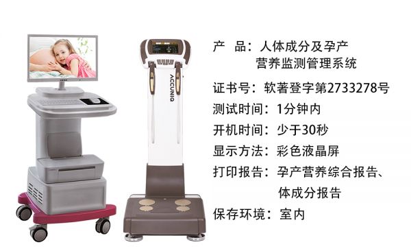 产品由人体成分测试分析仪、孕期个体营养监测管理系统、电脑、APP系统、打印机等组成。