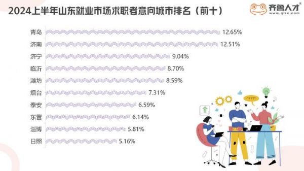 数据显示,2024上半年山东就业市场求职者意向城市排名中,青岛和济南分别占比12.65%和12.51%,成为山东求职者就业首选地;济宁、临沂和潍坊分别以9.04%、8.70%和8.59%的占比排在第三至第五位。