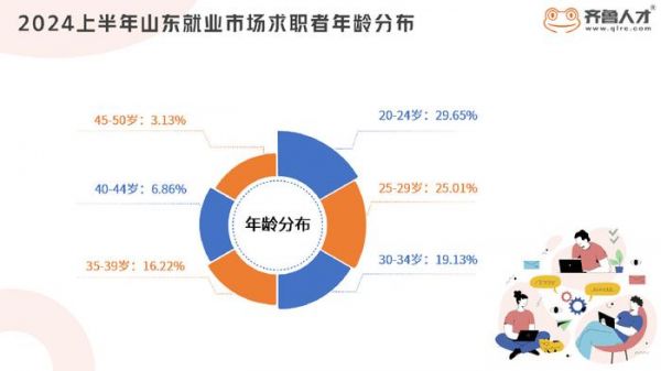 由上图可以看出,2024上半年山东就业市场求职者中,20-24岁求职者占比为29.65%,25-29岁求职者占比为25.01%。综合来看,30岁以下人群为求职主力军,他们具备较高的教育水平、创新思维和适应能力,对新技术、新行业充满好奇与热情,是推动社会经济发展的重要力量。