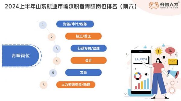 如图所示,2024上半年山东就业市场求职者青睐岗位排名中,财务/审计/税务、技工/普工、行政专员/助理、会计、文员、人力资源专员/助理占据榜单前六位,其中除了技工/普工岗位,其余均为文职岗位,可见求职者对文职岗位的热爱与追捧。