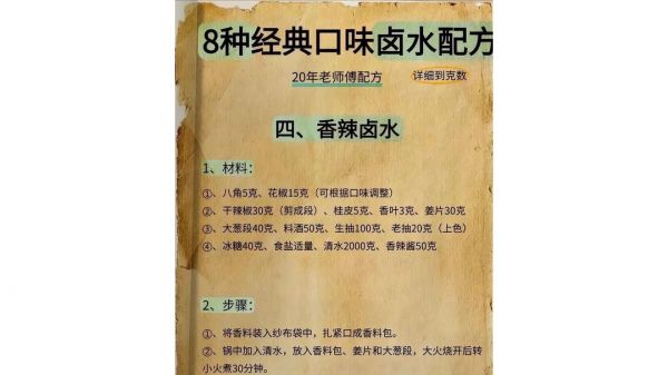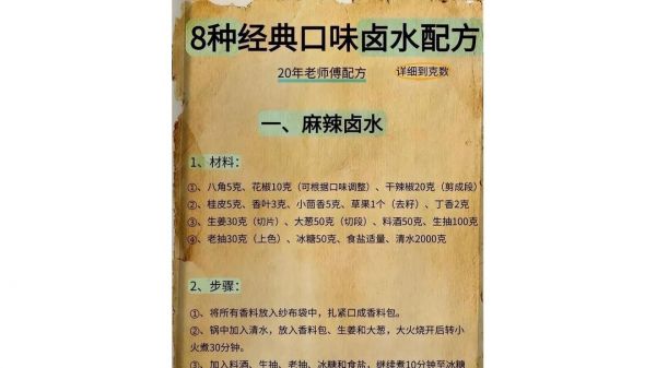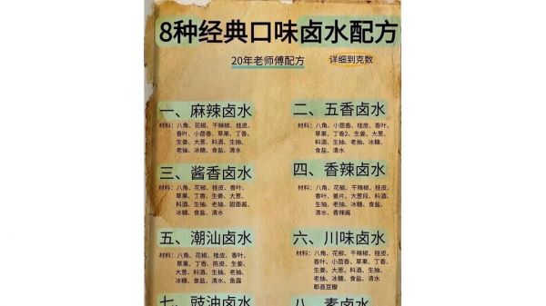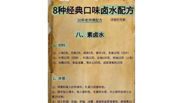 有了这8种经典的卤水配方,不管你喜欢麻辣、五香,还是酱香、香辣,都能在家轻松做出美味的卤味。赶紧按照配方准备材料,开启你的卤味制作之旅吧,相信你也能做出让家人朋友赞不绝口的卤菜!