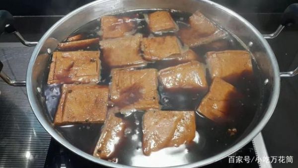 将豆干放入煮滚的卤汁中,用小火卤20分钟,食用前切片,再用卤汁稍微烫一下,味道更好。