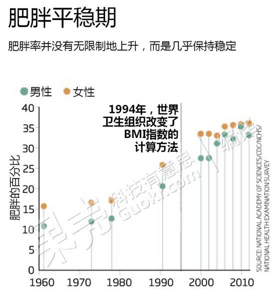人群中超重者所占的比例,并不像之前认为的那样会持续上升,而是稳定在了大约34%这个水平上。图片来源:《新科学家》