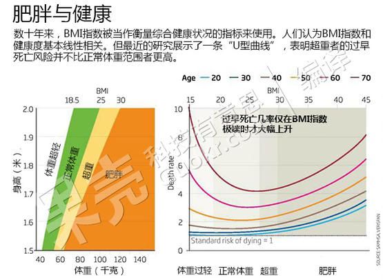 这就是BMI指数始终无法区分健康的胖子和不健康的瘦子的原因。这两类人群在近期的研究中频繁出现。举例来说,2013年一项涉及43000人的研究探讨了肥胖和心血管疾病的联系。其中46%的肥胖人群在代谢上毫无问题,无人拥有高血压、高胆固醇、胰岛素抵抗等通常与肥胖相伴的症状。这类“健康肥胖”人群的心血管疾病或癌症死亡率,与代谢上同样健康、体重普通的人群没有任何区别(参见《欧洲心脏杂志》,第34卷,389页)。基于这项持续25年研究的规模,文章作者推测,这种代谢上健康但身体肥胖的状态在一般人群中应该很常见。同时越来越多的研究正着眼于探讨肥胖悖论,表明BMI指数似乎连作为衡量人口一般健康状况的指标都无法胜任。