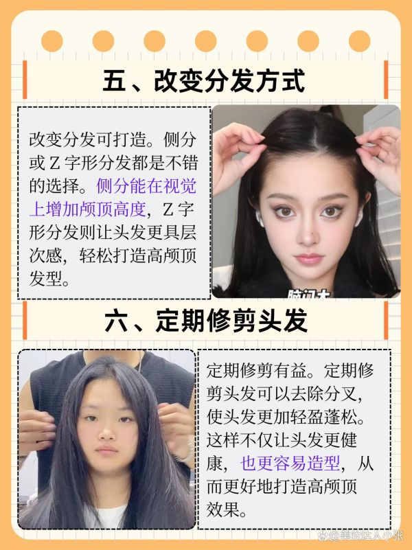 平时习惯中分的人可以尝试侧分,将头发往一侧梳,然后用发卡固定。这样可以在视觉上增加颅顶的高度,同时也能让发型更加有层次感。也可以尝试 Z 字形分发,将头发分成 Z 字形,这样可以让发根更加蓬松,打造出高颅顶的效果。