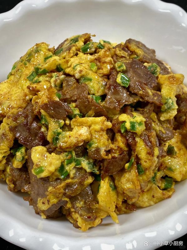 同一口锅再加少许油,倒入蛋液,煎至边缘定型后轻轻推开,放入炒好的牛肉,翻炒均匀即可出锅。