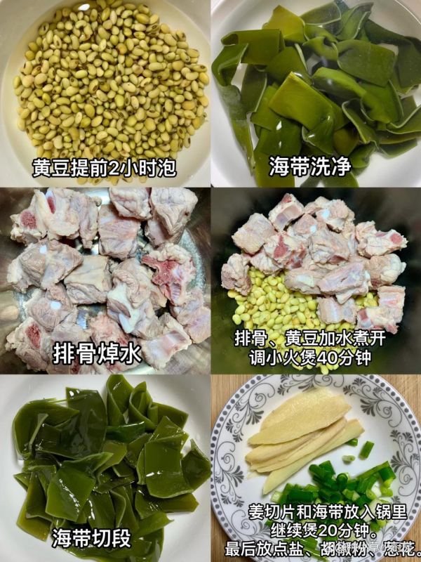 黄豆提前用清水泡 2 小时;海带洗净切小段;排骨冷水下锅焯水,撇去血沫后捞出洗净;
