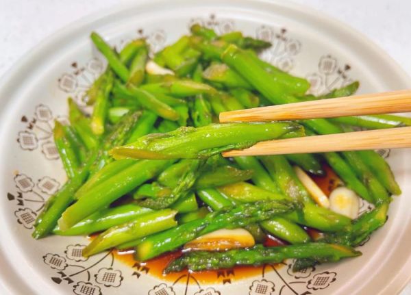 做法:首先把芦笋洗净并切成段,再将大蒜切成碎末。芦笋焯水捞出控干水分。随后,向锅中倒入油并烧热,放入蒜末使其爆香,接着把芦笋倾入锅中快速翻炒均匀,加入适量盐进行调味,而后迅速出锅装盘。