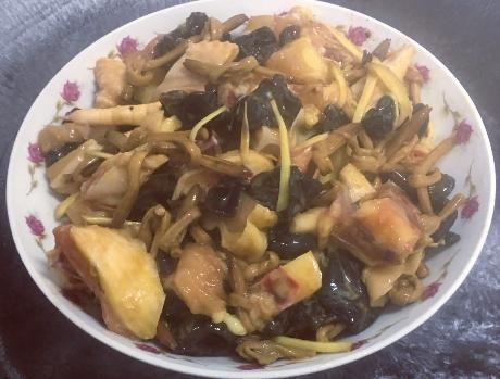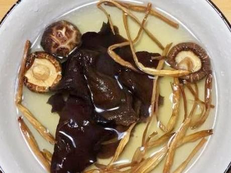 制作过程:第一步,干黄花菜、木耳和香菇等,需要事先放入在温水中将其泡发,然后分别处理干净,木耳和香菇的蒂分别去除掉,挤干其中的水,待用;