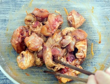 2、最好是用鸡腿肉做这道菜,口感会更加好,鸡肉事先需要加上各种调味料腌制一会,让其更加入味,而且还可帮助去除一定的腥味,记得要加上点食用油,这样可以帮助锁住食材的水分,用生油便可;