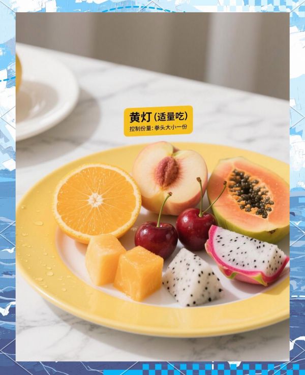 黄灯(适量为宜):包含橙子、桃子、李子、樱桃、木瓜以及火龙果(白心)等水果。食用时需留意控制摄入量。