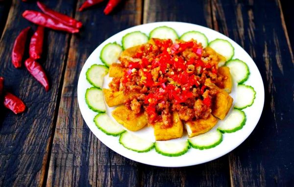 材料:老豆腐,小米辣,黄瓜,植物油,有机豆瓣酱,大豆素肉末