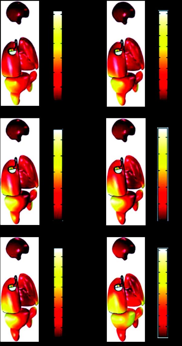 科研人员进一步分析了心脏起搏器植入人体后的温升变化,发现温升值随功率增加而上升,但各功率下人体组织器官的温升均小于1℃,心脏起搏器的温升也远低于有源植入式器件的安全阈值。