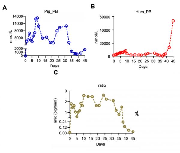 移植后第 1 天,血清中猪与人的初级胆汁酸比率从 0.014 急剧增加到 1.811,表明猪移植物对胆汁酸合成进行了有效补偿。