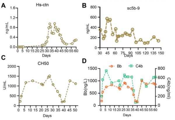 血清总补体活性(CH50)测量显示,从第 5 天开始显著增加,在第 26 天和第 27 天达到峰值 1514U/mL。