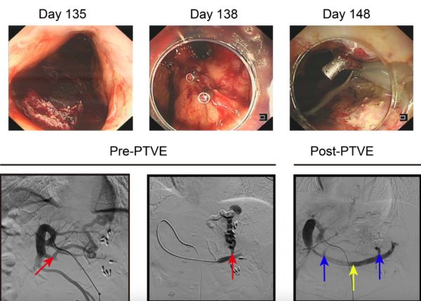 移植术后第 135 天,患者突然出现上消化道出血,在保守治疗无效后紧急进行内镜止血。术后第 138 天和第 148 天再次出血,均通过内镜止血。