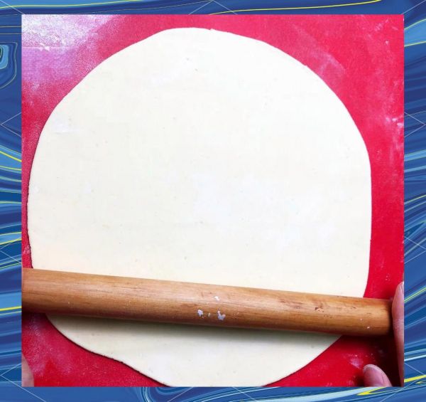 5、将醒发好的面团置于案板上,用擀面杖轻轻擀压,直至形成薄薄的一层。