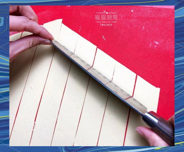 6、将擀压好的面皮,先以刀切出竖条,再沿着斜面方向切下,使面皮呈现出菱形的效果。