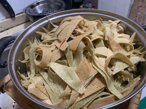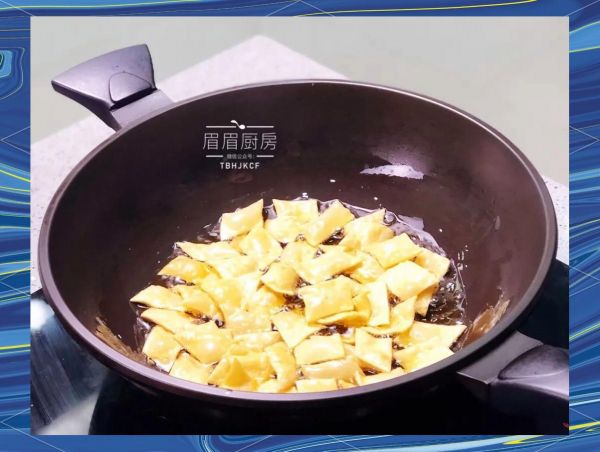 7、将鹅妈妈炒锅预热,随后倒入适量植物油并加热至六七成热,接着将切好的面皮放入锅中进行煎炸。