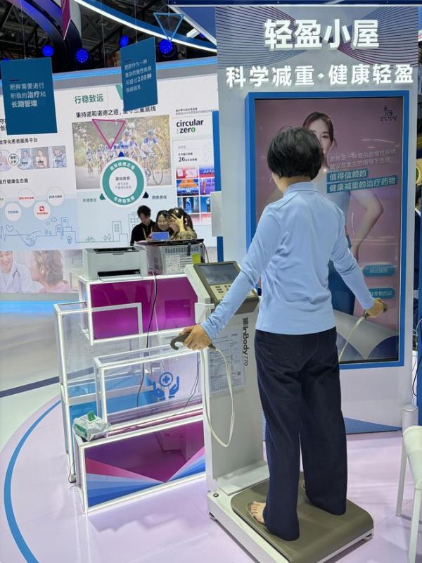 诺和诺德则在进博会展台打造了首个聚焦肥胖症管理的沉浸式体验空间——轻盈小屋,通过“认知提升、科学治疗、长期管理”全周期场景的体验,推动公众从“被动接收肥胖症知识”向“主动学习和积极管理肥胖症”转变,用更加生动的互动体验,提升公众对肥胖症科学诊疗和长期管理的认知。在“认知提升”场景中,公众可通过AI视觉识别互动技术看见“变胖的自己”,结合相应的科普知识及健康风险提示,唤醒对肥胖症的重视。“科学治疗”部分包括医院与零售两大场景,旨在展示“院店协同”新模式,助力打通肥胖症院内外管理闭环,提升肥胖症管理的便利性、科学性与依从性。该区域摆放了一台人体成分分析仪,吸引了不少人驻足测试。“长期管理”是肥胖症全病程管理的重要一环,该场景依托诺和诺德数字化患者服务平台“诺和关怀”,展示了数字化解决方案在肥胖症长期管理中的重要作用。