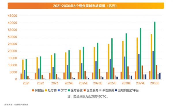 随着亚健康、孕产康复、银发等人群健康管理意识提升,医疗器械市场规模不断扩大。动脉网&新浪微博联合发布的《2024大健康行业营销白皮书》显示,医疗器械市场规模在2021-2030年间保持稳定增长并始终位列第一。2023年6月,阿里健康研究院、天猫健康发布的《2023诊疗家庭化消费趋势洞察》数据显示,2/3的健康电商用户购买过家用医疗器械。