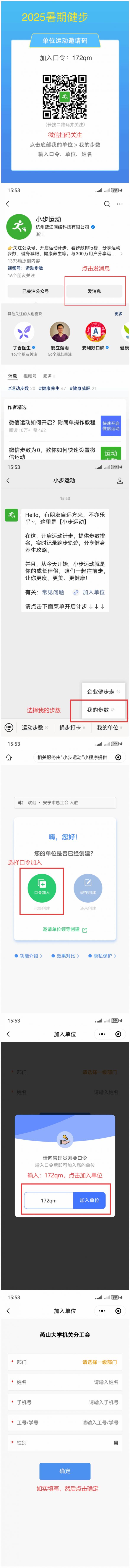 4、计步方式:本次活动采用微信小程序“小步运动”,请大家扫码关注公众号,点击底部我的单位>我的步数后,输入口令:172qm,完善个人信息(单位、姓名),即可参与活动。请各位老师在活动开始前尽早加入小程序,测试功能。