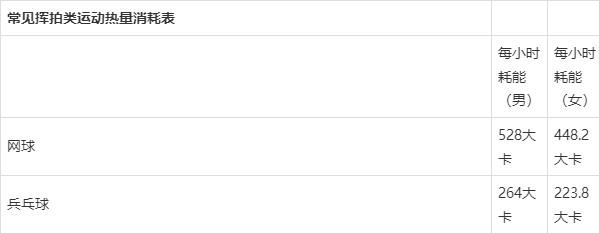 减脂人群适当延长运动时间对于想要减脂的人来说,在进行挥拍类运动的时候,千万不要“站桩”,而应积极地跑动着接球,才能消耗更多热量。并且需要注意的是,减脂效果与运动持续时间的长短有重要关系,在运动刚开始时,身体主要消耗的是体内的糖原,运动一段时间后,才开始主要调动脂肪供能。所以建议进行挥拍类运动时最好至少坚持40分钟到1小时。如下是常见挥拍类运动的热量消耗,可以根据自己的兴趣或喜好选择。
