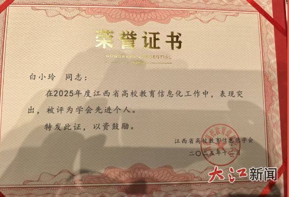 大江新闻讯 2025年12月29日,江西省高校教育信息化学会发布《关于表彰学会2025年度先进单位和个人的决定》(学会字〔2025〕17 号)通知,评选确定先进单位48个、先进个人48位。南昌健康职业技术学院荣获“2025年度江西省高校信息化工作先进单位”称号,白小玲荣获“2025年度江西省高校信息化工作先进个人”称号。