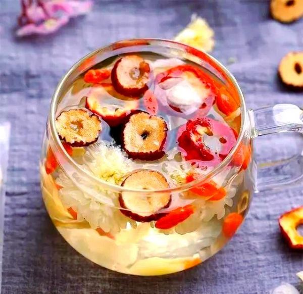 菊花枸杞茶:将金银花和枸杞用清水浸泡片刻,洗净后备用。将清洗好的金银花与绿茶一同放入茶杯中,注入热水,盖上盖子焖泡3分钟,即可品尝。