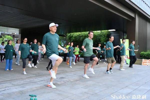 4月20日早上,年会开始之前,一场健康社群活动率先举行。受广州天气影响,原定的骑行活动被迫取消,冉永夫带领近百人人进行了以“YOLO”为主题的无绳跳绳活动。运动过程中,冉永夫一边勉励队友们跟紧音乐节奏,一边时不时以诙谐幽默的表现活跃气氛,缓解运动本身的枯燥乏味。在他的带动下,跳绳活动充满欢声笑语,不少路人也受到感染加入运动中来。