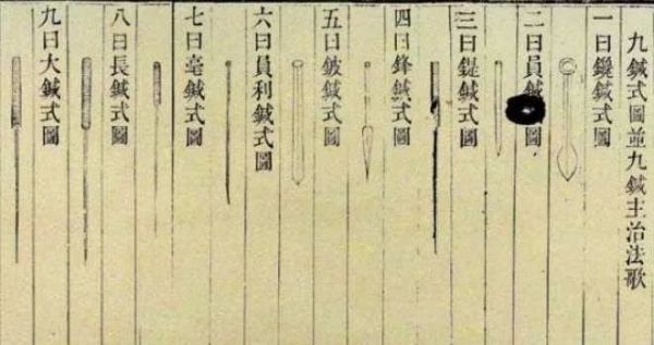 1968年河北满城西汉刘胜墓中出土了九针,其中4根金针、5根银针,系《灵枢》所论之九针,反映了两千年前我国针灸艺术的高度水平。九针、“医工盆”,以及小型银漏斗、铜药匙、药量、铜质外科手术刀等组成了迄今发掘出土的质地最好、时代最早、保存最完整的一整套西汉时期医疗器具。