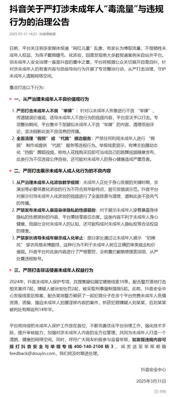 但未成年人安全治理一直是抖音的重中之重,平台将根据公众关切展开自查自纠,针对涉未成年人的有害内容与低俗导向行为开展了专项整治行动,从严打击治理,守护未成年人清朗网络空间。