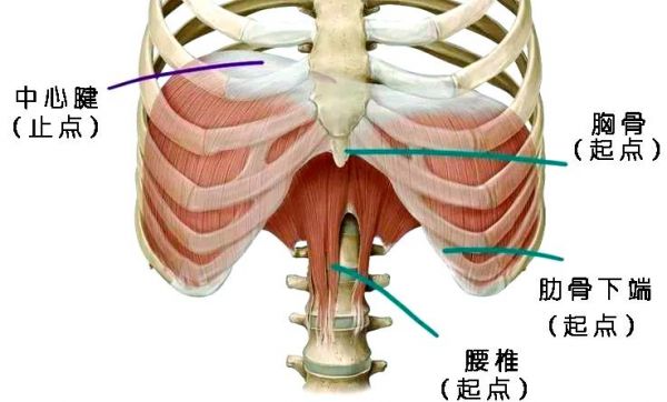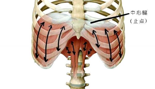 在胸式呼吸中,中心腱(止点)的位置保持稳定,而肋骨下端(起点)则被提起并展开。这种呼吸方式有助于增加胸腔的容积,进而为肺部提供更多的空间进行气体交换。