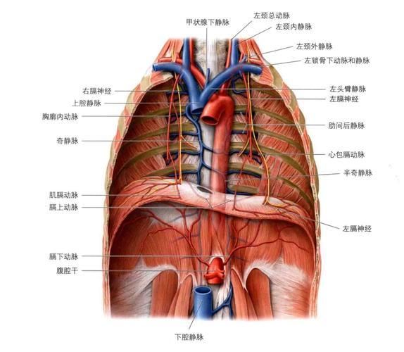 膈肌,作为连接胸腔与腹腔的重要肌肉,其肌束起源于胸廓下口周缘和腰椎前侧,分为胸骨部、肋骨部和腰部三个部分。肋部肌束起自下六对肋骨和软肋骨,而腰部则以左右两个隔脚起自第二和第三节腰椎。这些肌束全部汇聚于中央的中心腱,构成了膈肌的主体结构。其外周部为肌性部,而中央部分则是腱膜,共同构成了膈肌的复杂结构。