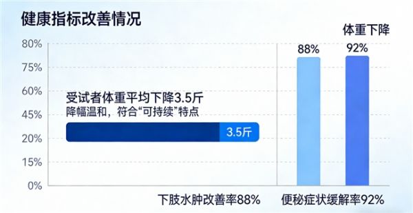 ①根据为期12周的临床观察数据,参与试验的受试者体重平均减少3.5斤,变化趋势平稳,体现出可持续的体重管理特点。与此同时,受试群体中88%的人下肢浮肿情况有所改善,另有92%的人便秘问题得到缓解。这表明产品通过调节脏腑机能,促进了身体多余水分的代谢和体内积食、废物的排出,实现了身体内部环境的改善。
