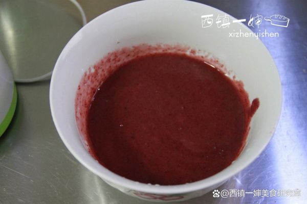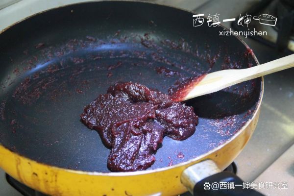 2、不粘平底锅烧热,然后倒入蔓越莓泥,中小火不停的翻炒,将水分渐渐炒干。