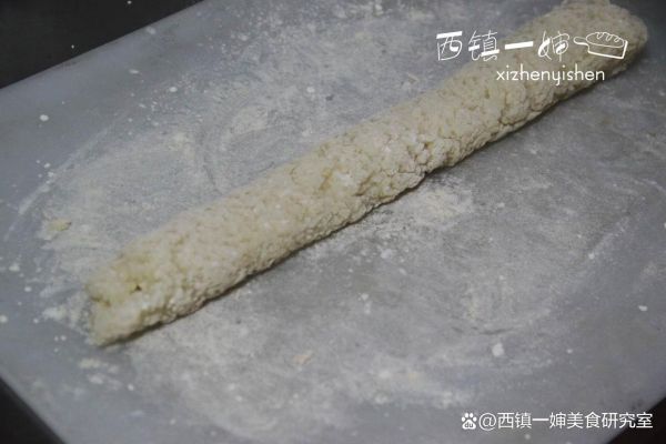 4、案板上先铺一层熟面粉,手上也沾一些,取适量煮好的糯米饭,搓成这样的长条状。