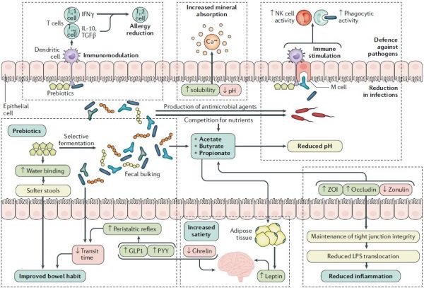 4.益生元作为底物,通过被宿主微生物选择性利用而对健康有益;益生元可防御病原体,作用于免疫调节、矿物质吸收、肠道功能、代谢作用和饱腹感等;