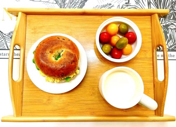 早餐:享用110g贝果,搭配50克鸡蛋和60g生菜,再饮200ml牛奶。