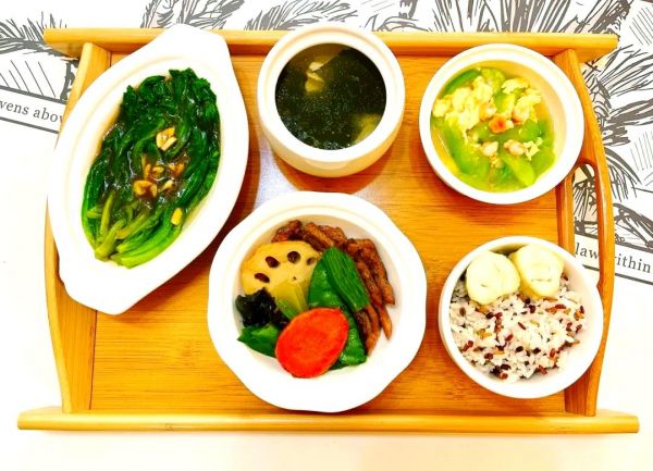 中餐:享用15克牛柳,搭配100克丝瓜、25克鸡蛋、150克生菜、25克内酯豆腐、5克裙带菜,主食选择60克大米和30克红薯。