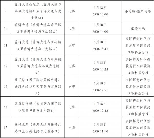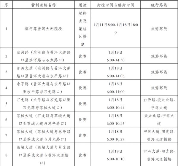 (一)起、终点区域管制:滨河路普洱大剧院段,1月11日8:00至1月18日18:00实施交通管制措施;
