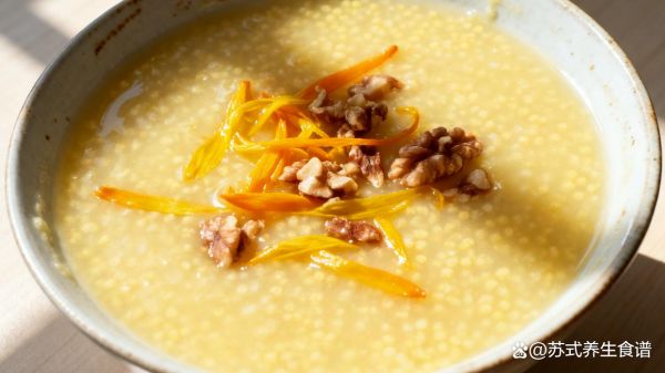 小米养胃,搭配食材双补大脑。取干黄花菜30克(泡发切小段)、核桃碎25克、小米60克、大米20克。大米和小米加清水煮20分钟,加黄花菜段煮10分钟,出锅前撒核桃碎搅匀。软糯清淡,益智健脑还护胃。消化功能较弱者可将核桃碎煮久一点。