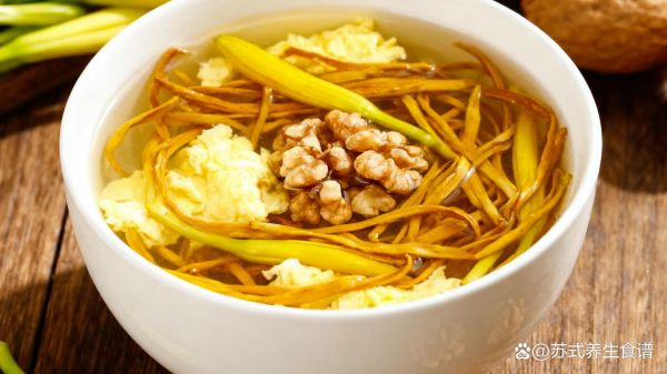 鸡蛋补营养,汤品清爽不腻。取干黄花菜40克(泡发切段)、核桃碎20克、鸡蛋2个(打散)、葱花少许。清水煮沸,下黄花菜段煮5分钟,淋入蛋液搅成蛋花,撒核桃碎、葱花,加盐和香油调味。清淡鲜香,益智健脑还解渴。对鸡蛋过敏者禁用。