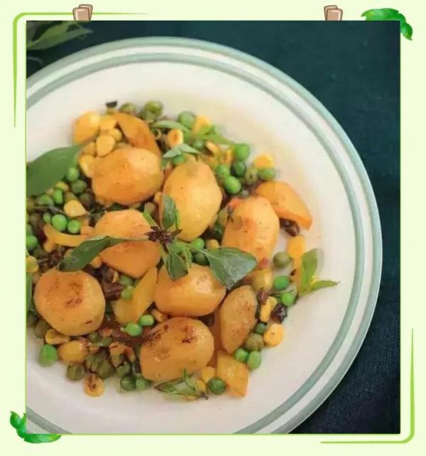 材料:小土豆、绿豆、玉米粒、彩椒、九层塔
