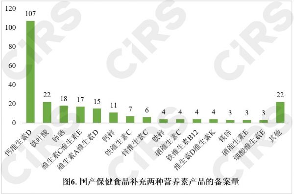 在营养素补充剂中,补充维生素C的产品、补充钙和维生素D的产品以及补充多种维生素矿物质的产品为三大主流产品,备案数量分别为201款、107款和281款。以DHA藻油为原料的保健食品走进大众视野,功能为补充n-3多不饱和脂肪酸,其备案数量位于单一营养素产品的第三名。