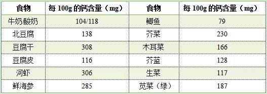 常见钙含量丰富的食物如下表所示