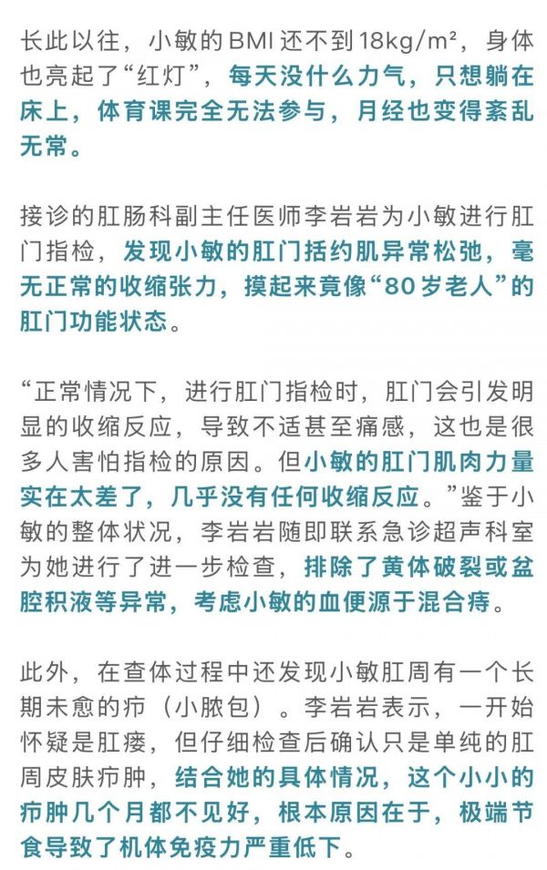 其实,小敏的案例并非个例,此前有媒体报道,一位15岁的女孩为了追求苗条身材,将近50天的时间里,除了喝水,未摄入任何食物,她身高165厘米,体重却一度降至仅24.8公斤。送医时,已处于重度营养不良、呼吸衰竭的状态,最终因多器官衰竭,永远地离开了这个世界。