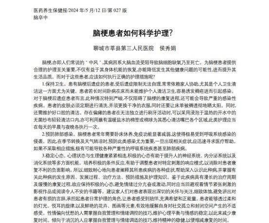 [1]侯秀娟.脑梗患者如何科学护理?[N].医药养生保健报,2024-05-12